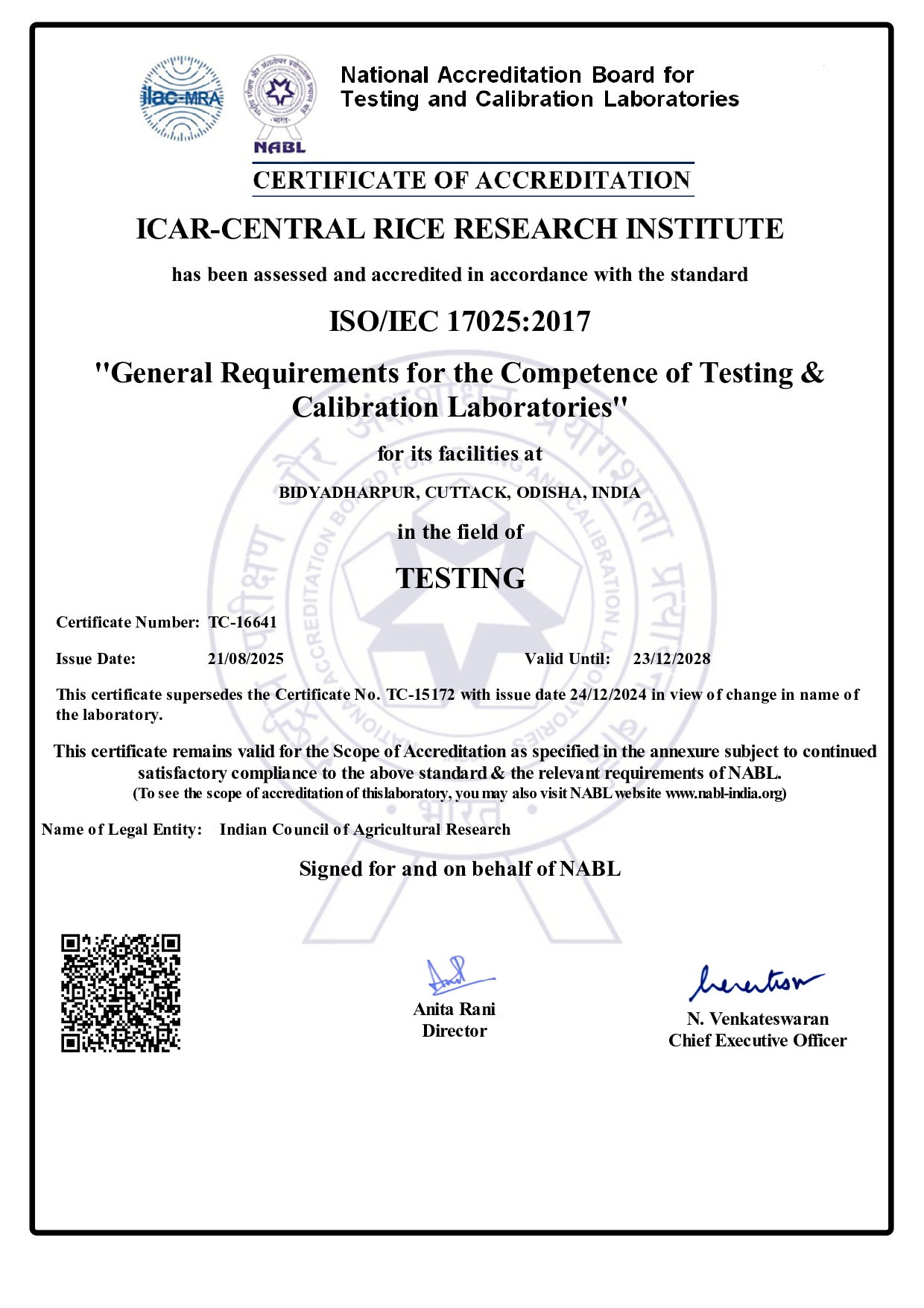 ICAR-Central Rice Research Institute, Cuttack, Odisha has received accreditation from the National Accreditation Board for Testing and Calibration Laboratories (NABL) under the ISO/IEC 17025:2017 standard for chemical testing. This accreditation is effective from December 24, 2024. This accreditation encompasses three key laboratories namely, Pesticide Residue Laboratory, Micronutrient and Heavy Metal Laboratory and Food Quality Laboratory covering 84 parameters under the Groups, Residues and Contaminants in Food and Agricultural Products (Pesticides and Heavy metals) & Food and Agricultural Products (Micronutrient and Food quality parameters) for rice and rice products. The ICAR-Central Rice Research Institute, Cuttack, is committed to provide the highest quality analysis conforming to international standards in the scope specified.