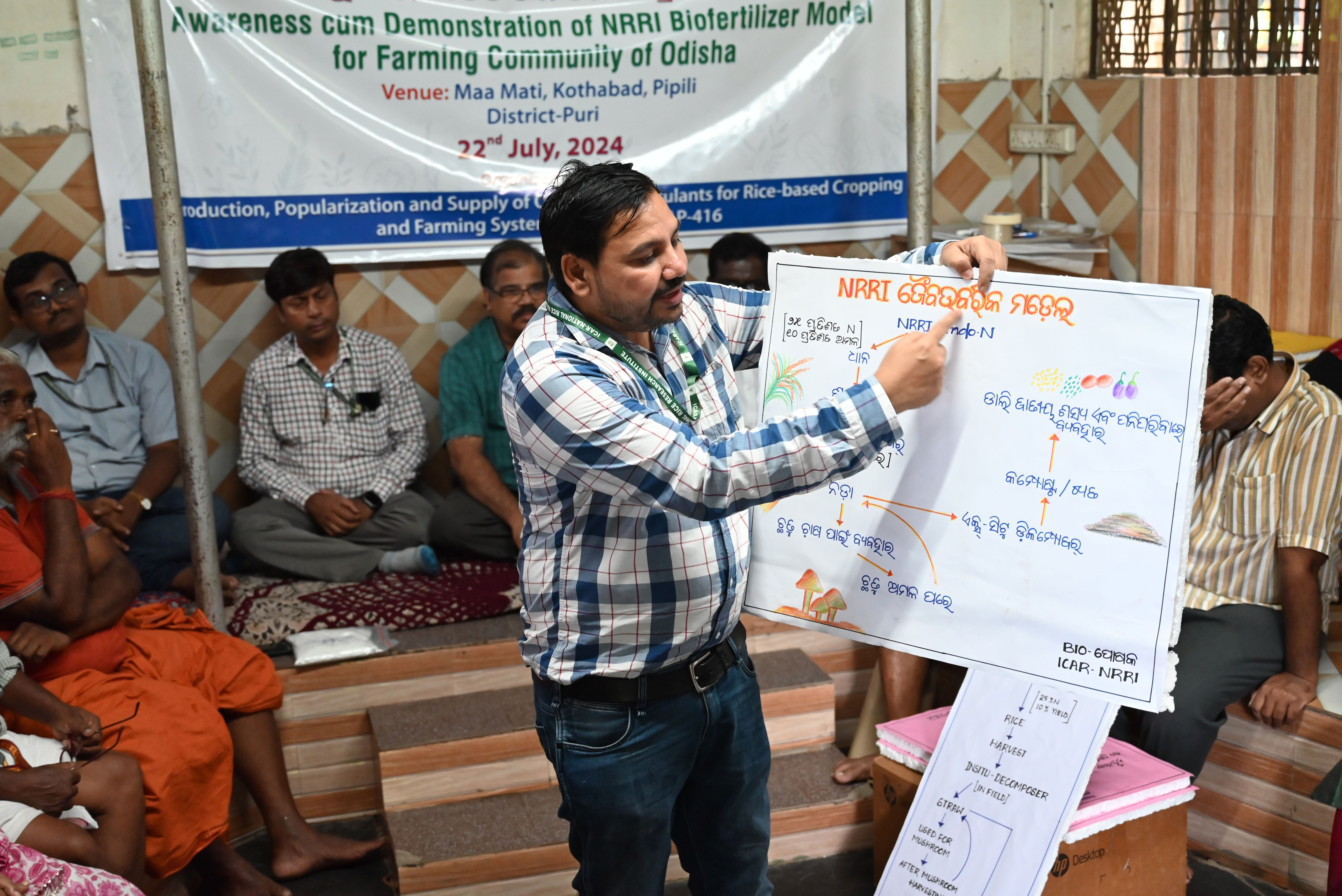 ओडिशा के कृषक समुदाय के लिए एनआरआरआई जैवउर्वरक मॉडल का जागरूकता सह प्रदर्शन 22 जुलाई 2024 को ओडिशा के पुरी जिले के पिपिली प्रखंड में माँ माटी, कोठाबाड़ा में आरकेवीवाई परियोजना “ओडिशा के चावल आधारित फसल और खेती प्रणाली के लिए गुणवत्ता वाले बायोइनोकुलेंट्स का उत्पादन, लोकप्रियकरण और आपूर्ति”शीर्षक परियोजना (बायो-पोषक) के तहत आयोजित किया गया।