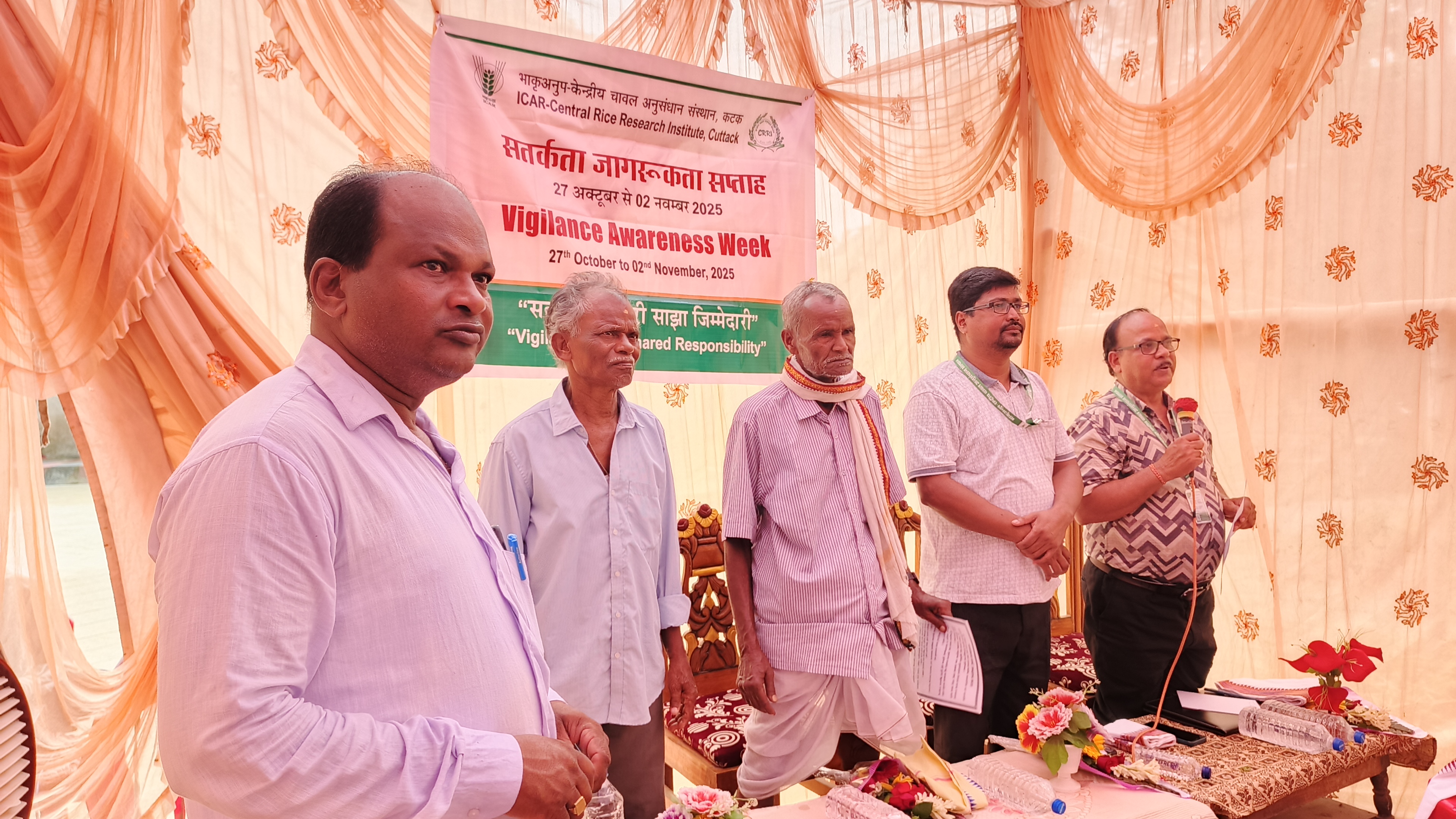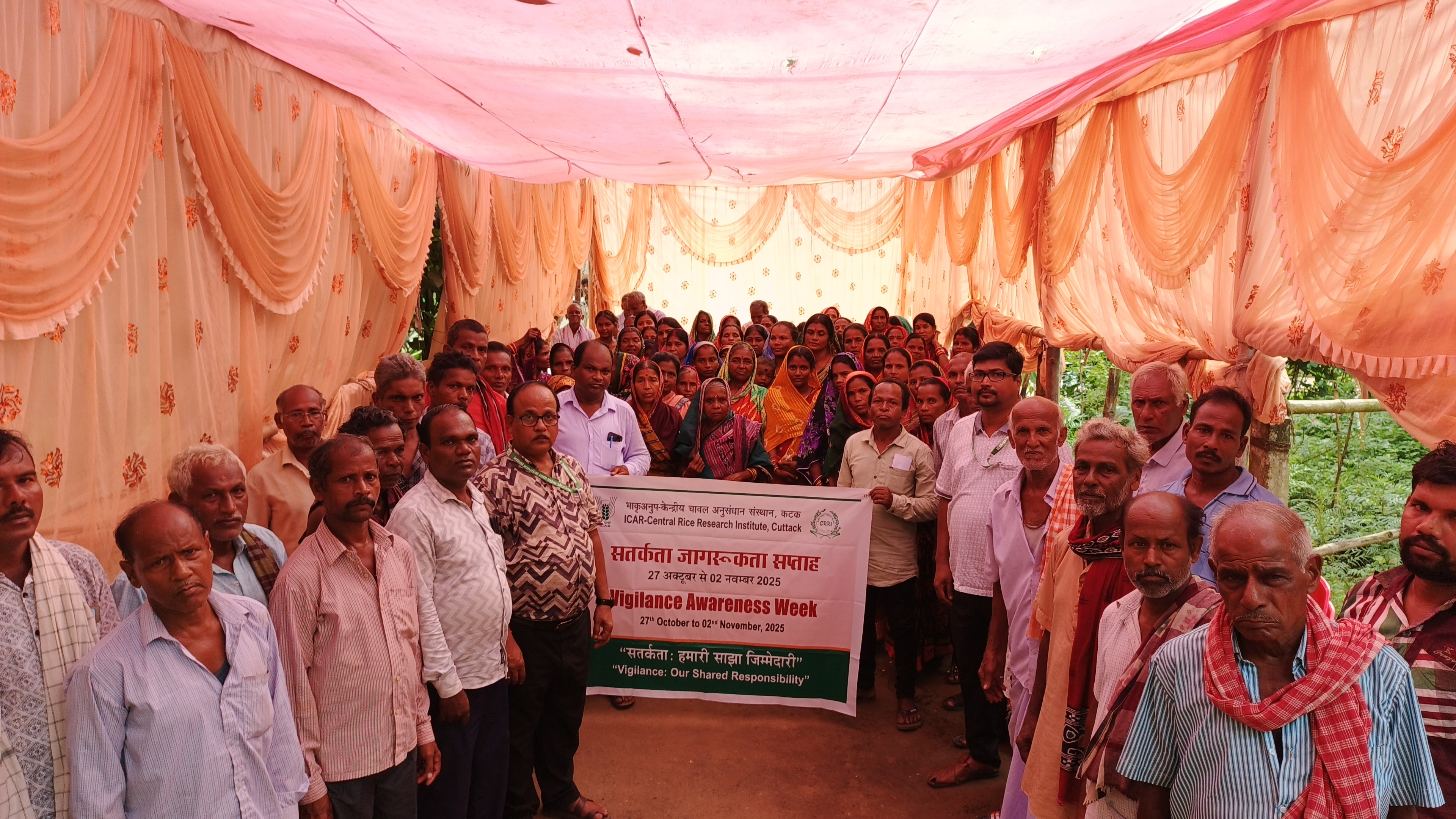 A Gram Sabha on the occasion of Vigilance Awareness Week was conducted on 01.11.2025 at Sudusailo village, Kantapada block, Cuttack district, on the theme “Vigilance is Our Shared Responsibility.” A total of 95 farmers, comprising 52 males and 43 females, were present at the meeting. In the programme, Shri Maheswar Jena (Ward Member), Shri Abhay Mallick, Shri Jayram Bhoi, Shri Bishnu Charan Behera, Shri Ram Chandra Bhoi (progressive farmers), students, and members of eight SHG groups participated. The meeting was conducted in the presence of Dr. Srikant Lenka, Principal Scientist, and Dr. P. C. Jena, Senior Scientist, of ICAR–CRRI, Cuttack. The programme began with the Vigilance Pledge. The villagers were made aware of the ill effects of corruption and were encouraged to uphold ethical values in their personal and professional lives. They were also educated about various means and ways to strengthen the fight against corruption and to build a transparent, corruption-free society.