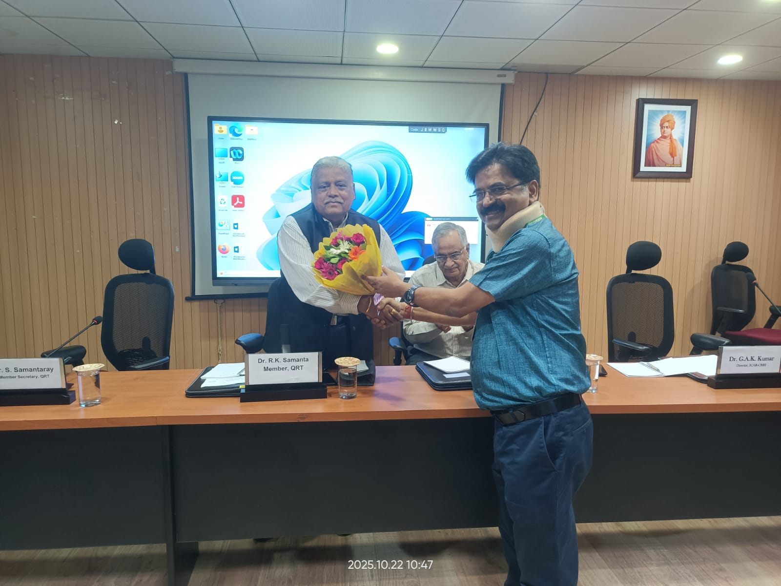 माननीय क्यूआरटी के सदस्यों ने 22 अक्टूबर 2025 को भाकृअनुप-केंद्रीय चावल अनुसंधान संस्थान (सीआरआरआई), कटक का परिदर्शन किया। कार्यक्रम के आंरभ में, फसल उन्नयन प्रभाग के अध्यक्ष और सदस्य सचिव डॉ. संघमित्रा सामंतराय ने क्यूआरटी के सदस्यों का हार्दिक स्वागत किया। बैठक में क्यूआरटी सदस्यों, डॉ. आर.के. सामंत, बीसीकेवी, पश्चिम बंगाल के पूर्व कुलपति और श्री के.वी. अय्यर, आईआईटी, खड़गपुर में एग्रीबिजनेस फाउंडेशन के विशेषज्ञ ने अपने विचारोत्तेजक वक्तव्य दिए जिन्होंने संस्थान के सभी वैज्ञानिकों के साथ विचार-विमर्श किया तथा संस्थान में चल रहे अनुसंधान कार्यकलापों की सराहना की। सीआरआरआई के निदेशक डॉ. जी ए के कुमार ने भी उपस्थित सदस्यों को संबोधित किया और संस्थान द्वारा हाल ही में की गई उपलब्धियों और भविष्य की अनुसंधान प्राथमिकताओं पर प्रकाश डाला। कार्यक्रम का समापन फसल उत्पादन प्रभाग के प्रधान वैज्ञानिक डॉ. पी. पन्नीरसेल्वम के धन्यवाद ज्ञापन के साथ हुआ। इसके बाद, क्यूआरटी सदस्यों ने संस्थान की विभिन्न प्रयोगशालाओं का दौरा कर अनुसंधान सुविधाओं और चल रही परियोजनाओं का अवलोकन किया।
