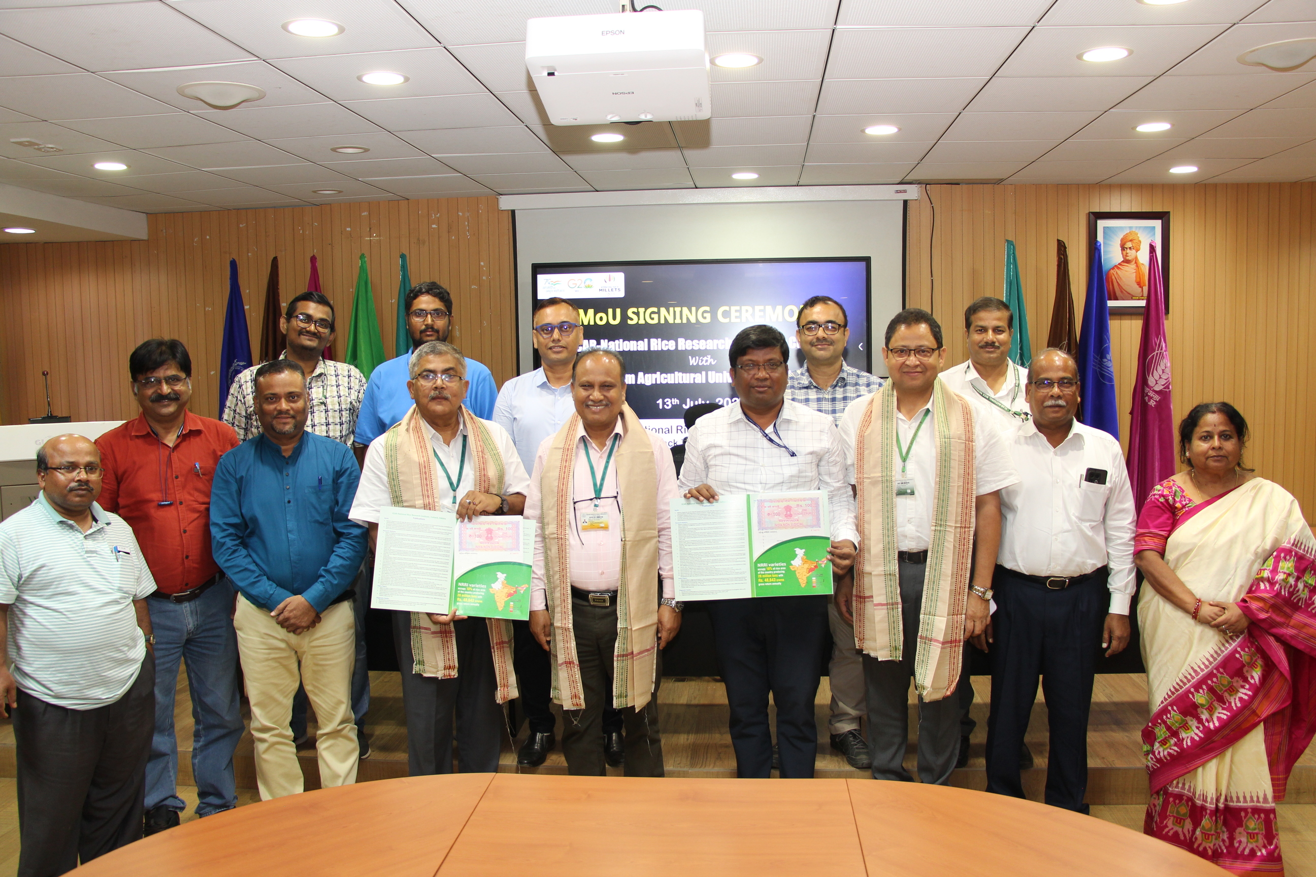 चावल अनुसंधान के क्षेत्र में सहयोग को बढ़ावा देने और विशेषज्ञता साझा करने की दिशा में एक महत्वपूर्ण कदम में, ओडिशा के कटक, में स्थित भाकृअनुप-राष्ट्रीय चावल अनुसंधान संस्थान (एनआरआरआई) और असम के जोरहाट में स्थित असम कृषि विश्वविद्यालय (एएयू) के तहत असम चावल अनुसंधान संस्थान द्वारा 13 जुलाई, 2023 को एक समझौता ज्ञापन पर हस्ताक्षर किया गया। समझौता ज्ञापन का उद्देश्य अनुसंधान और विकास, जननद्रव्य आदान-प्रदान, विद्यार्थी विनिमय कार्यक्रम, मानव संसाधन विकास तथा चावल से संबंधित नवाचारों के व्यावसायीकरण सहित विभिन्न क्षेत्रों में सहयोग की सुविधा प्रदान करना है। एनआरआरआई के निदेशक डॉ. ए.के. नायक ने एनआरआरआई की ओर से एवं असम कृषि विश्वविद्यालय, जोरहाट के अनुसंधान के डीन डॉ. मृणाल सैकिया ने समझौता ज्ञापन पर हस्ताक्षर किया। असम कृषि विश्वविद्यालय के माननीय कुलपति डॉ. बिद्युत चंद्र डेका ने मुख्य अतिथि के रूप में इस अवसर की शोभा बढ़ाई और इस सहयोग कार्यक्रम के लिए अपनी सराहना व्यक्त की। हस्ताक्षर समारोह कटक में स्थित भाकृअनुप-एनआरआरआई परिसर में हुआ, जिसमें असम कृषि विश्वविद्यालय के डॉ. संजय कुमार चेतिया एवं एनआरआरआई से डॉ. एम.जे. बेग, डॉ. जी.ए.के.कुमार डॉ. एस. सामंतराय, डॉ. पी. भट्टाचार्य, डॉ. एस.डी. महापात्र, डॉ. बी. मंडल, श्री वी. गणेश कुमार और श्री आर.के. सिंह उपस्थित थे।