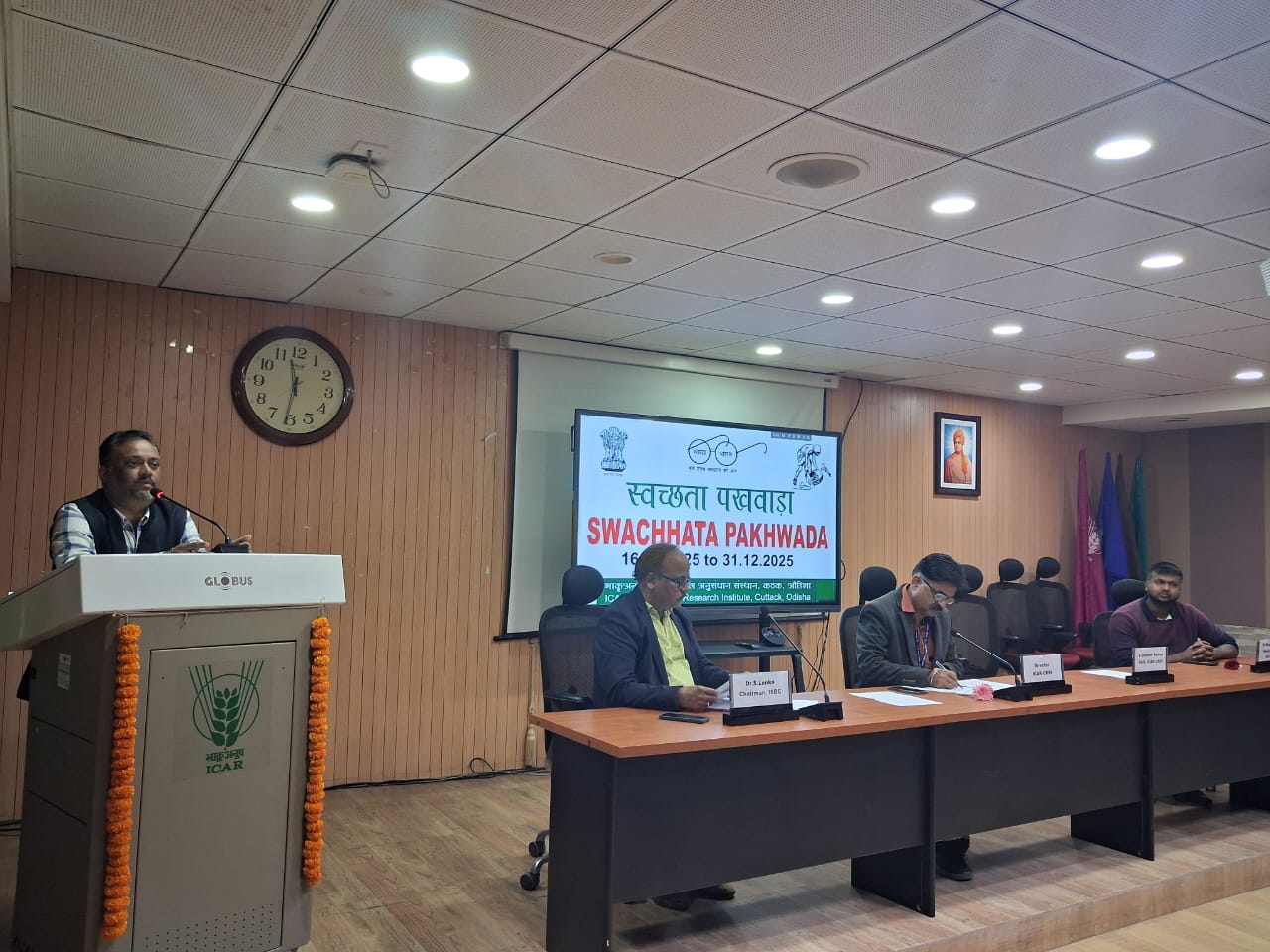 As per the direction from Secretary, DARE & DG, ICAR, New Delhi; ICAR-Central Rice Research Institute, Cuttack organized “Swachhata Pledge Day” on the very first day i.e, on 16-12-2025 at 11.00 AM on occasion of organization of Swachhata Pakhwada-2025. Dr. Srikanta Lenka, Chairman, Institute Swachha Bharat Committee briefed about different day to day activities under Swachhata Pakhwada-2025 (from 16-31st December, 2025) to be organized at the Institute, its residential premises, villages, tourist spots, hostels, educational institutions and local markets etc. The Director, ICAR-CRRI, Cuttack administered the “Swachhata pledge”. “Swachhata anthem” was displayed to all the staff members of the Institute and Director of the Institute urged the participants to include their co-workers into the Swachhata activity. In the programme Shri Ganesh Kumar, Sr.AO, ICAR –CRRI emphasized on non-use of single use plastics in the Institute/residential campus and `directed all the staff members not to use pan and other tobacco products during the office hours as an effort to keep our environment neat & clean and remain healthy. Also, on this day, “Swachhata awareness message” was spread by the Institute on this day through LED screen kept in the Reception Corner and banners in different locations outside the Institute. In this meeting organized at Dr. K. Ramiah Conference hall of the Institute; Heads of the Divisions, Sr.AO, Sr.FAO, Swachh Bharat Committee members, scientists and other staff members were present. A total of 80 participants attended the meeting and expressed their willingness join in the “Swachha Bharat Abhiyan”.